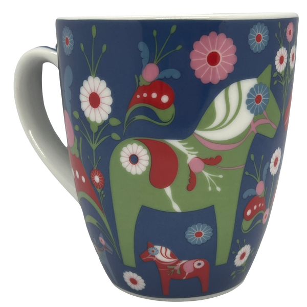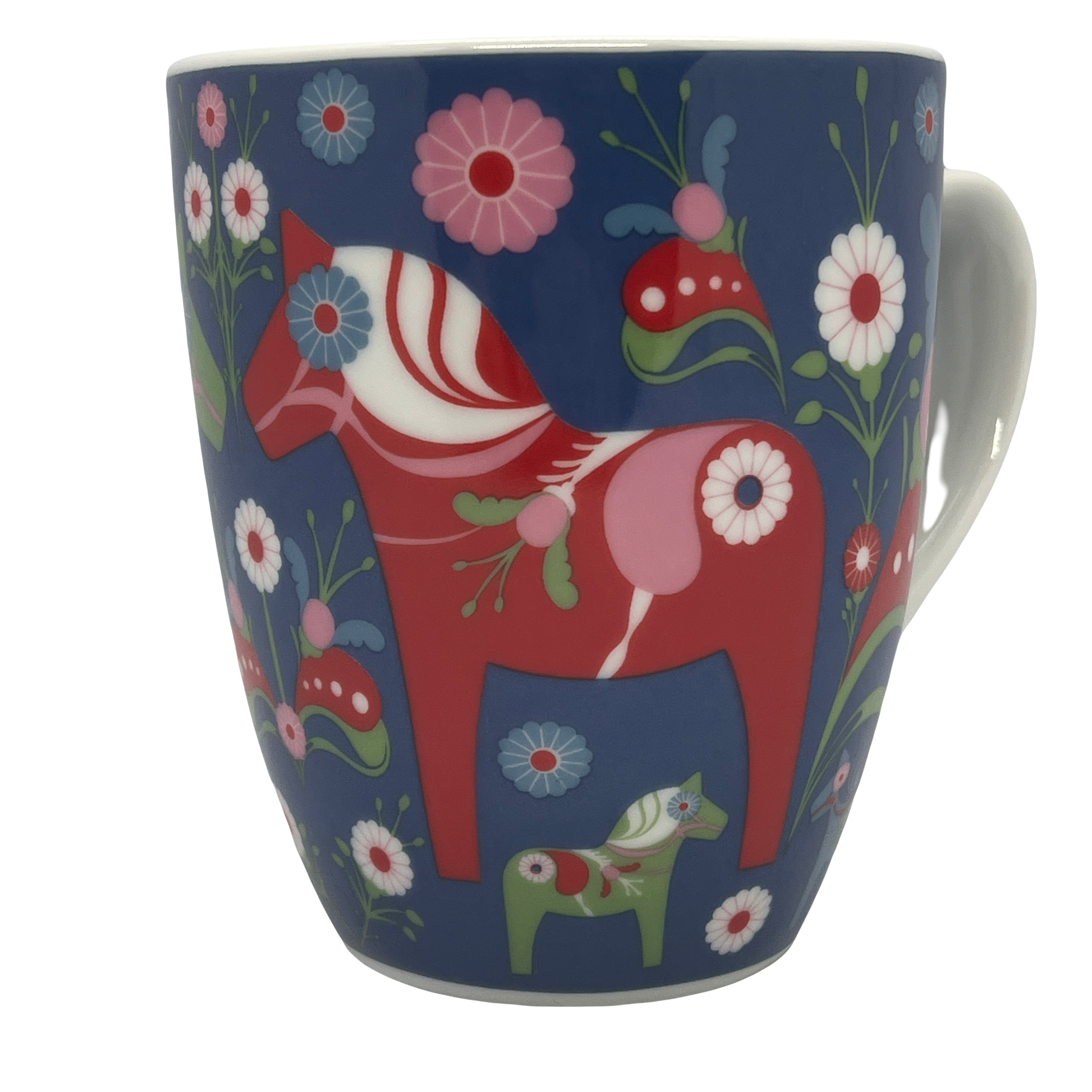 Make morning coffee fun and whimsical with the 2 Colored Dala Horse Bistro Mug. It's a great way to show some Swedish pride and style. It comes with the classic Dala Horse design with green, and red horses parading around the mug in a modern folk art design. Made in Sweden this mug is ceramic, microwavable, and just plain cool.