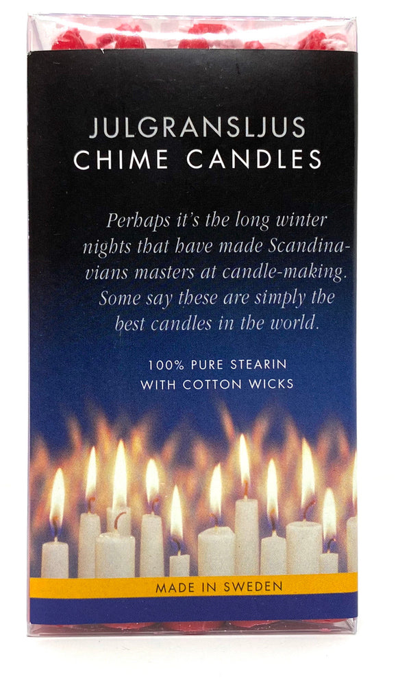 Seems pretty self explanatory: 20 candles in red, made in Sweden, and a perfect fit for the Angel chime rotary candle holder.