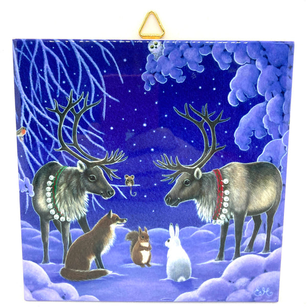 The Animals in the Woods Tile Trivet shows two reindeer having a meeting with a fox, squirrel, rabbit, mouse and owl. This tile is made of durable ceramic with a cork back and can be hung as a decoration or used as a pot trivet.