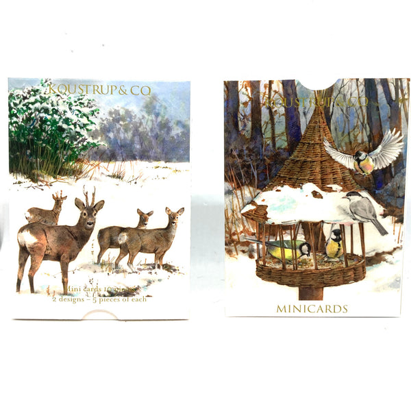 Bird Feeder and Deer Little Danish Art Notecards includes 2 different artistic designs, five notecards per design, for 10 cards and envelopes. The mini-cards will make a stunning note to a friend or family member. These cards are produced by Danish company Koustrup & Co.