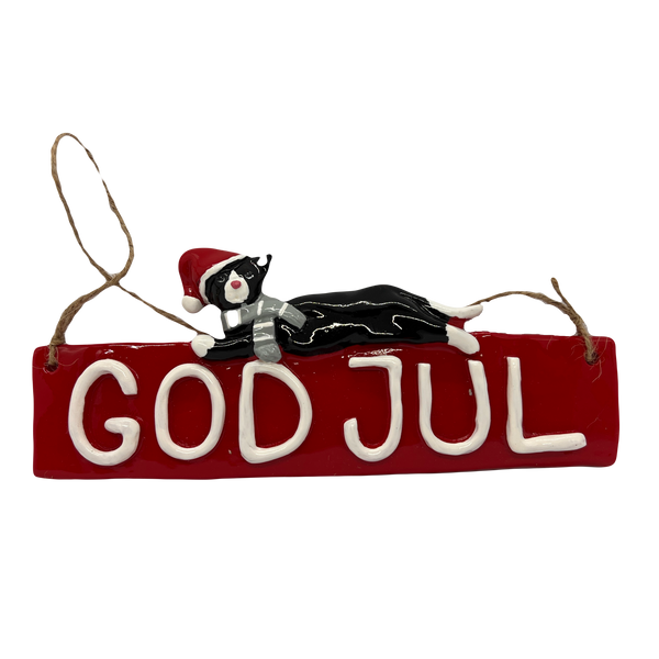 The God Jul Hanging Sign is made of durable resin with a God Jul sign and a cat with Santa hat resting on top. It is the perfect decoration to welcome guests into your home or to hang on your wall. Sign is hand painted.
