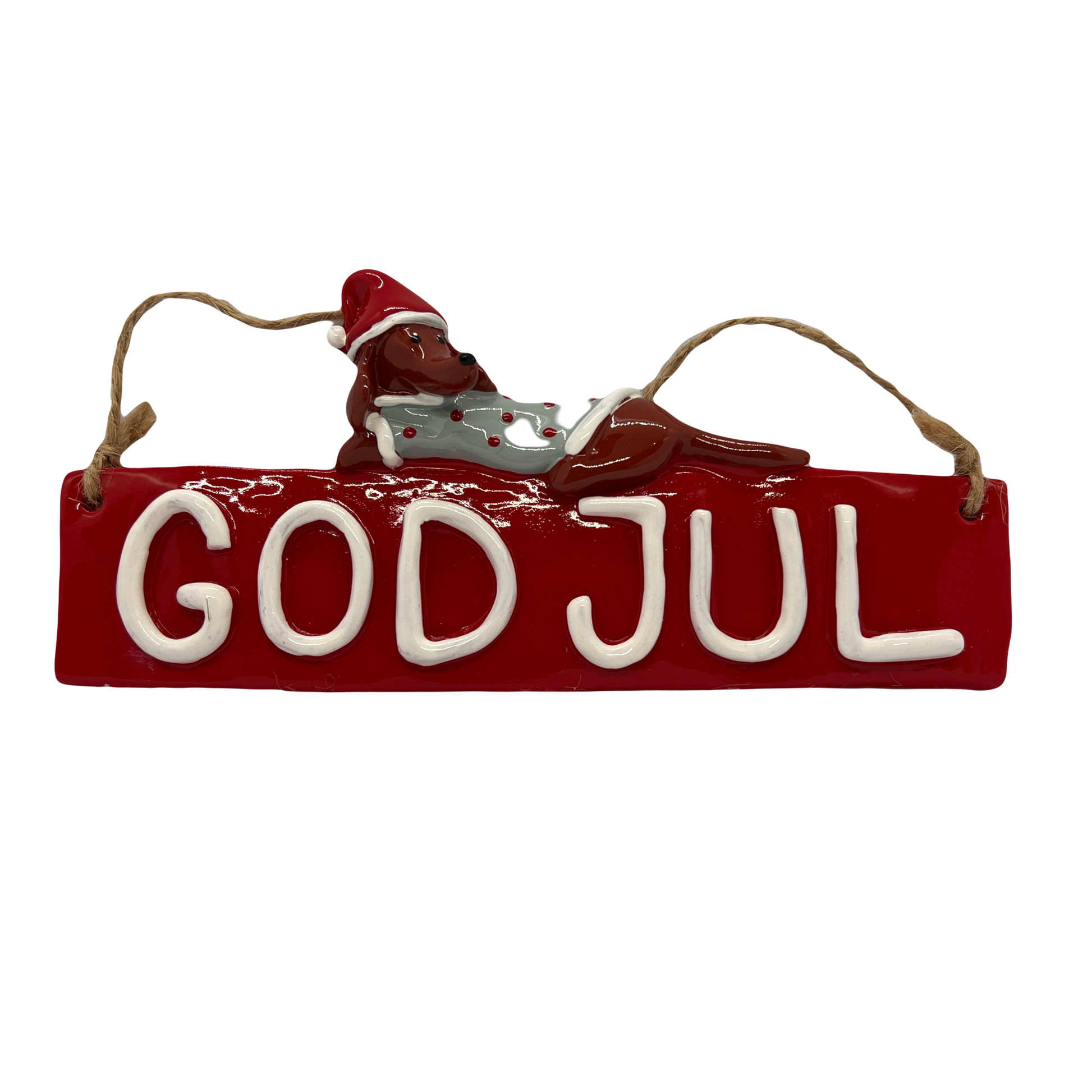 The God Jul Dog Hanging Sign is made of durable resin with a God Jul sign and a dog with Santa hat resting on top. It is the perfect decoration to welcome guests into your home or to hang on your wall. Sign is hand painted.