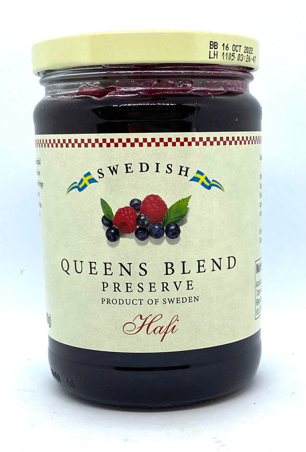 Halfi Swedish Queens Blend Preserves is an elegant marriage of raspberries and blueberries that are grown in Sweden's Forests.  The flavor made for a Queen.