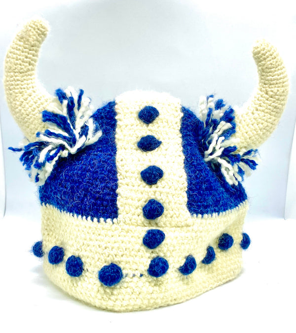 You will be able to conquer winter with the Viking Knit Helmet. This amazingly soft hat features horns and a rivet design in Finnish Blue and White. These hats are handmade in Peru in a fair trade environment that helps support local knitters and their families. One size fits most.