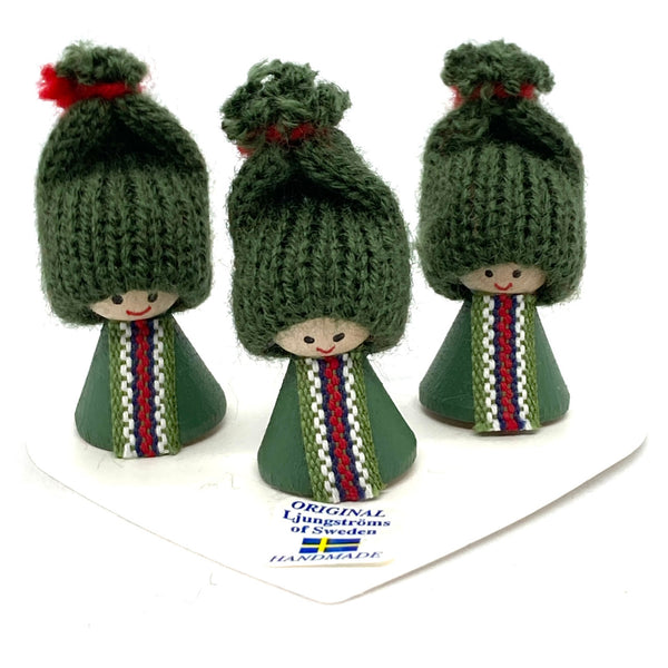 These Mini Tomten are bundled up little guys made of wood and woven hats. Handmade by Ljungströms of Sweden.