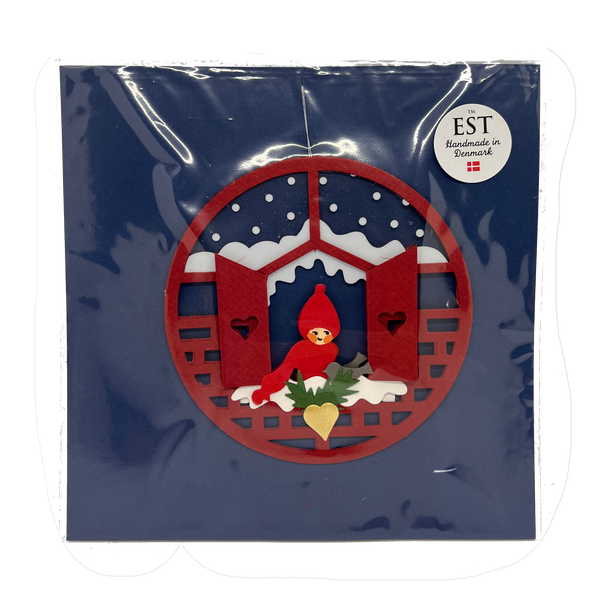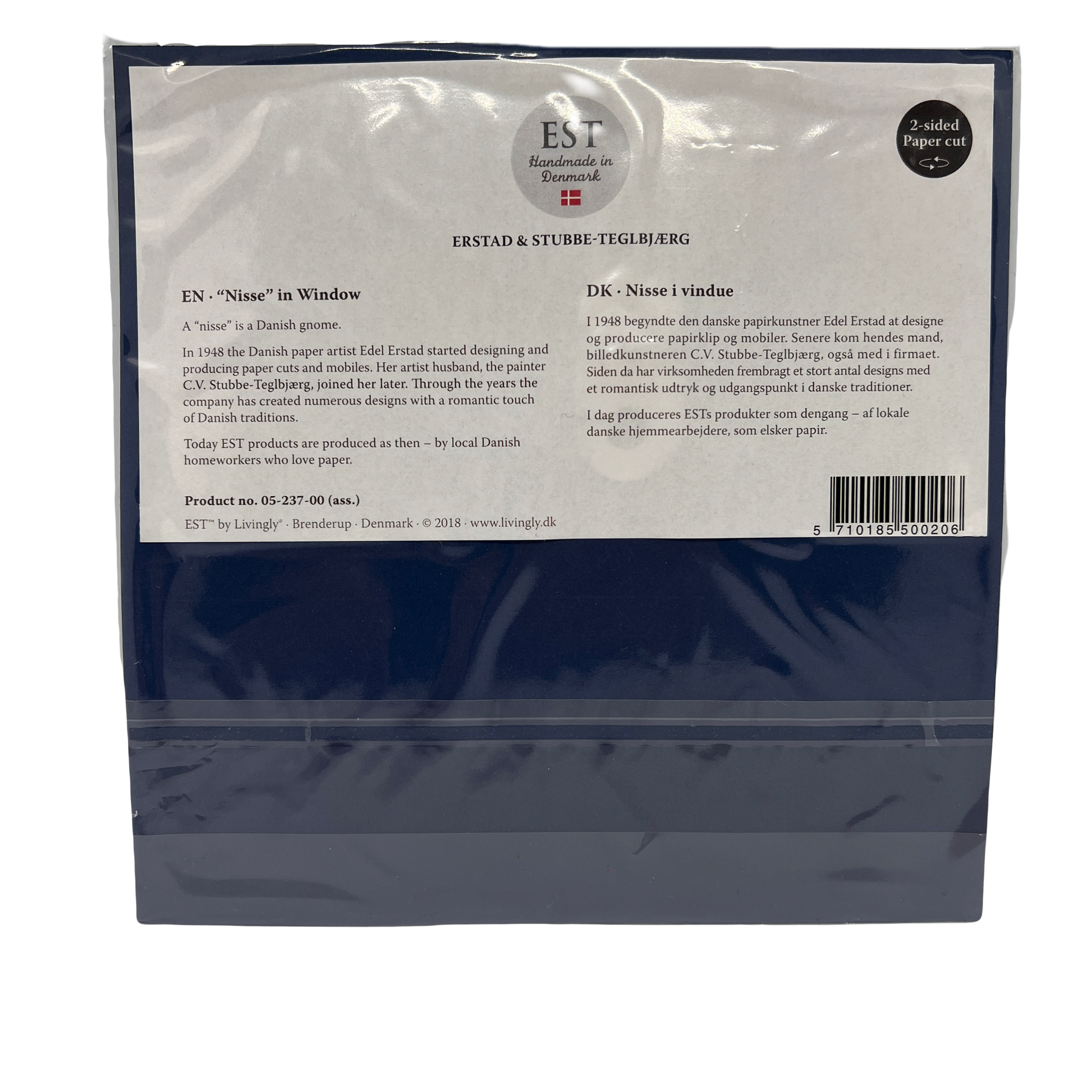 The Nisse in Window Ornament is a creation of Danish designer Edel Erstad and features a beautiful cut paper handmade ornament with a Nisse in a snowy window. It measures to a 5' inch circumference, and is produced by the EST company of Denmark.