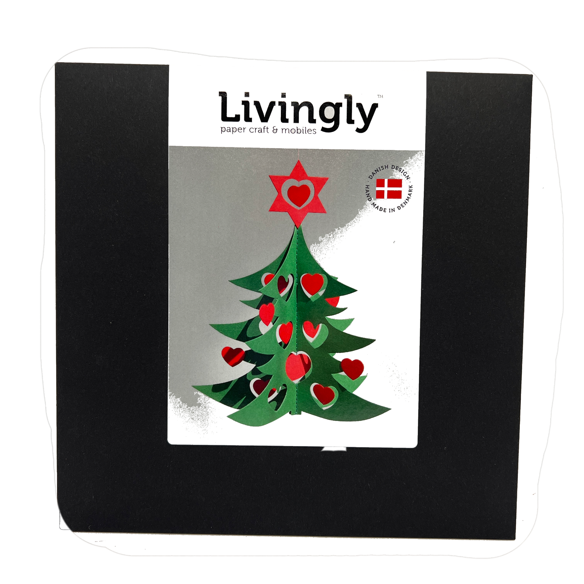 The Christmas Tree with Hearts Mobile is a creation of Danish designers Anna & Bent Knudsen and features a beautiful cut paper handmade mobile Christmas tree with heart ornaments. It measures to a 7' inch, and produced by the EST company of Denmark.
