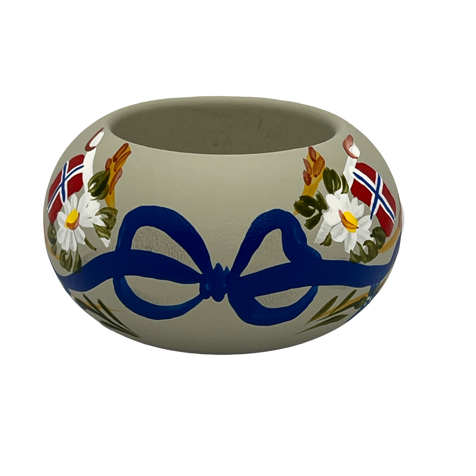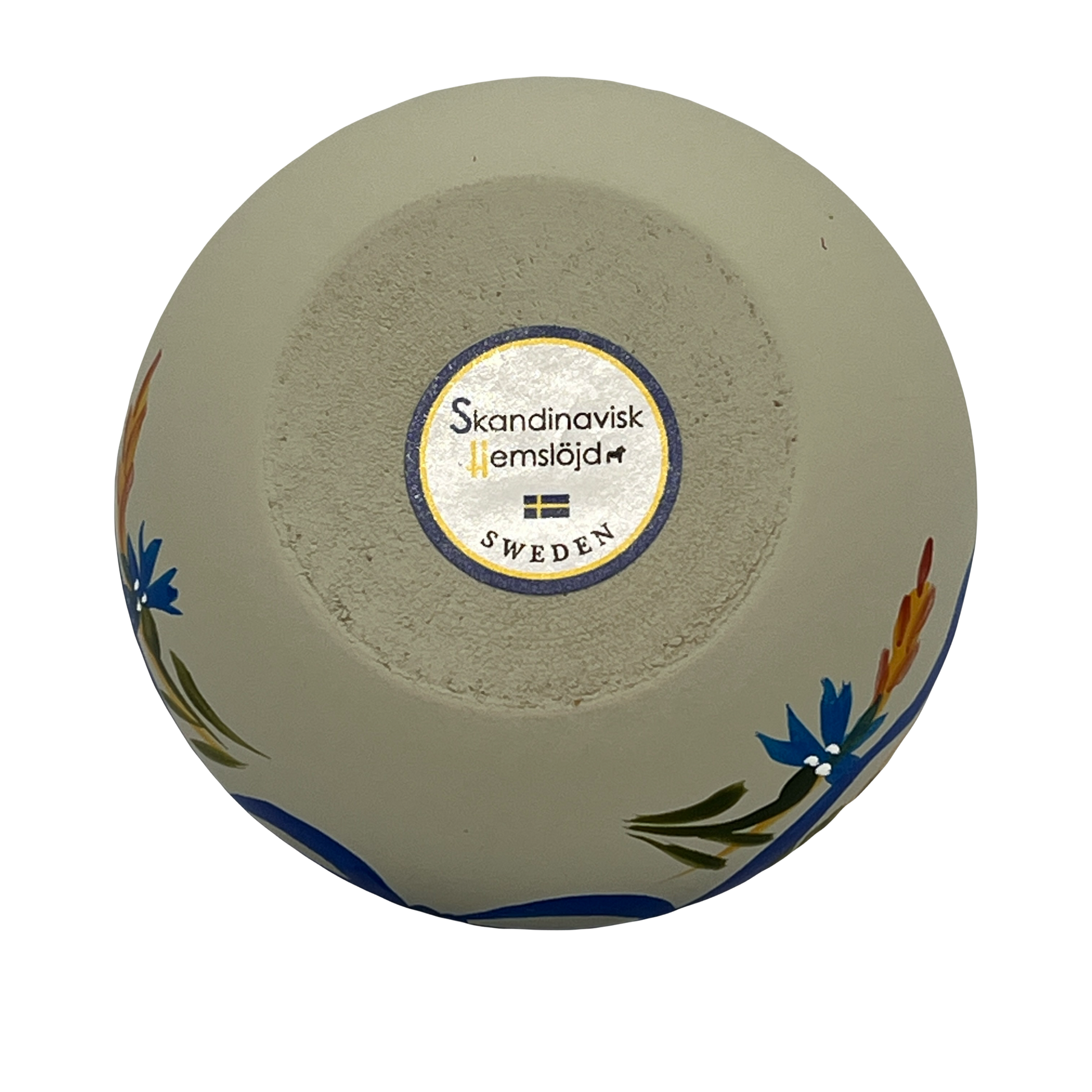 Light up your table or mantle with the beautiful Norwegian Flag Votive. Made in Sweden by Skandinavisk Hemslöjd this hand-painted pine votive depicts a traditional Swedish Flag, ribbon, and flower design on the side.