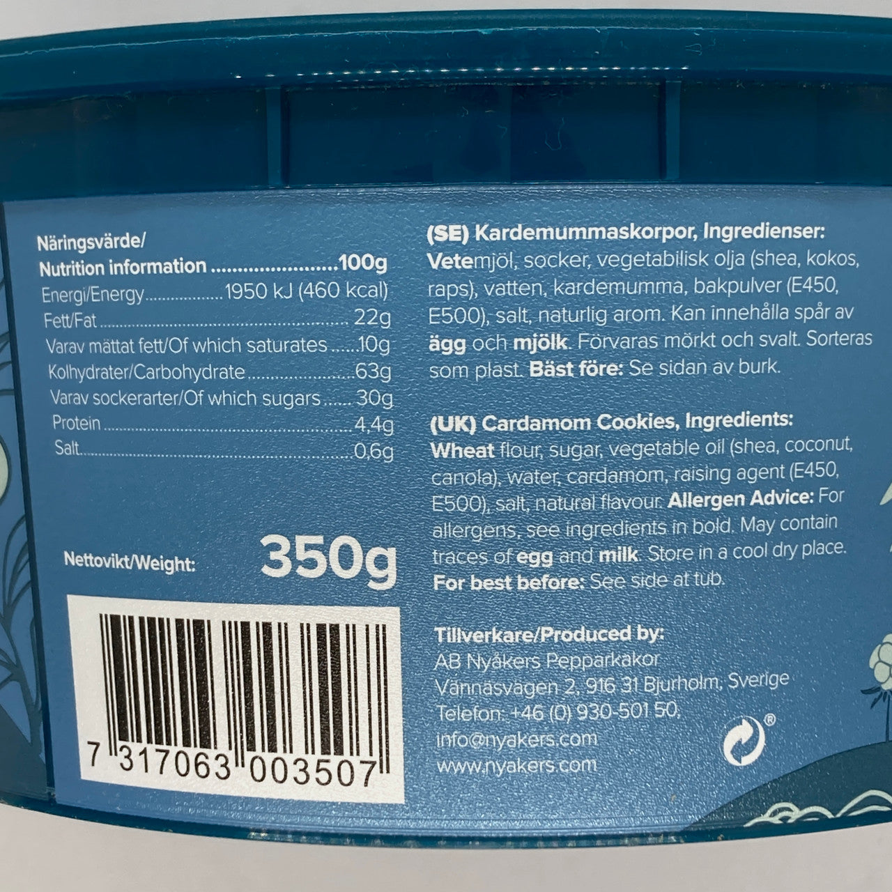 The Nyåkers Kardemumma Skorpor Cookies bring a light sweetness crispy crunch and wonderful cardamom flavor together in one little cookie. Made in Sweden and packed in a decorative plastic tub.