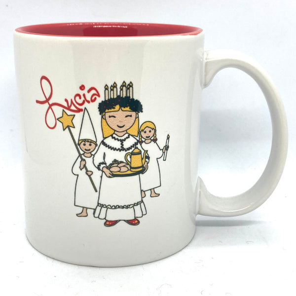 Celebrate the Holidays with Scandinavian style with the Santa Lucia, Star Boy, Attendant Coffee Mug. A cute Santa Lucia with candle crown, Star Boy with staff and Attendant will invoke everything holiday while you enjoy some coffee, hot chocolate, or a really large mug of Glögg. Made of durable ceramic the mug is microwave and dishwasher safe.