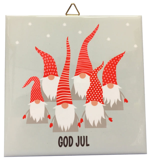 In this beautifully stylized Whole Lotta Tomten Trivet depicts a whole lotta Tomten with God Jul written below. This tile is made of durable ceramic and can either be hung as a decoration or used as a pot trivet.