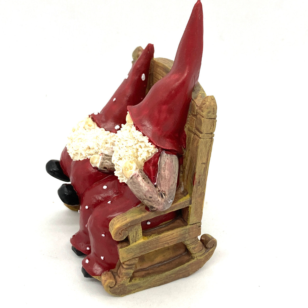 Tomte Elmer and Max show longtime friends relaxing together on a rocking chair. Made of durable resin and hand-painted in Sweden by Nääsgränsgården, they make a welcoming and happy addition to your household.