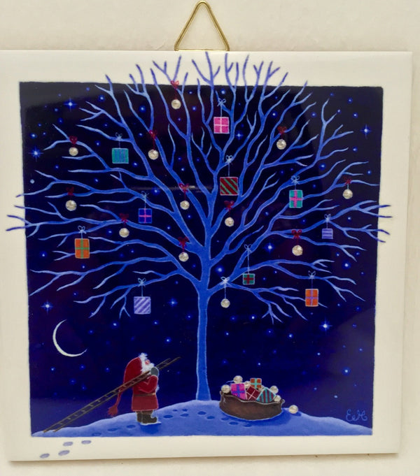 Add this wonderful Tomten Present Tree tile scene to your Christmas decorations. It is beautifully designed by Eva Melhuish who pictures Tomten hanging presents on a tree in a snow nightscape. It will invoke all your Scandinavian Christmas feelings, and set the tone for your holiday season.