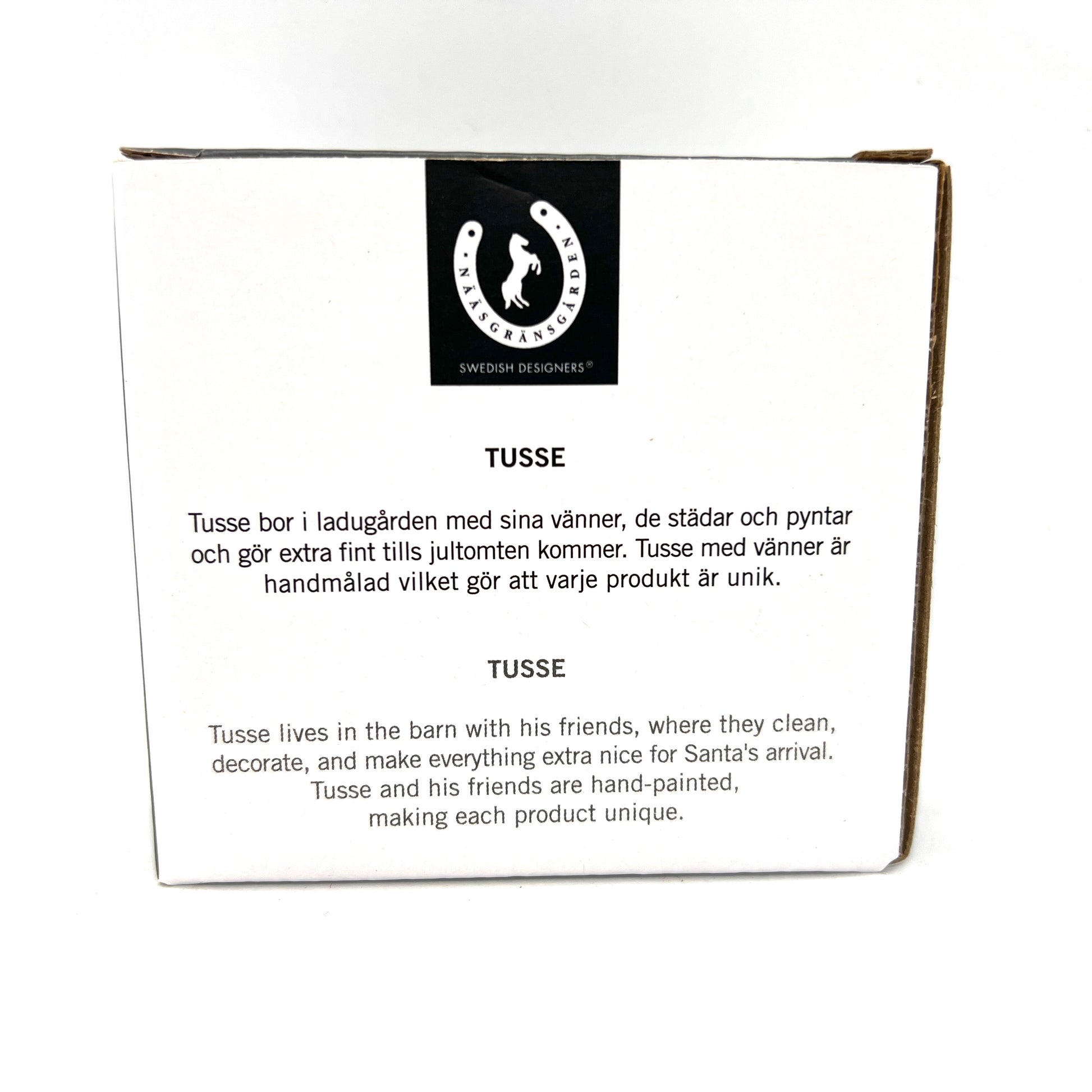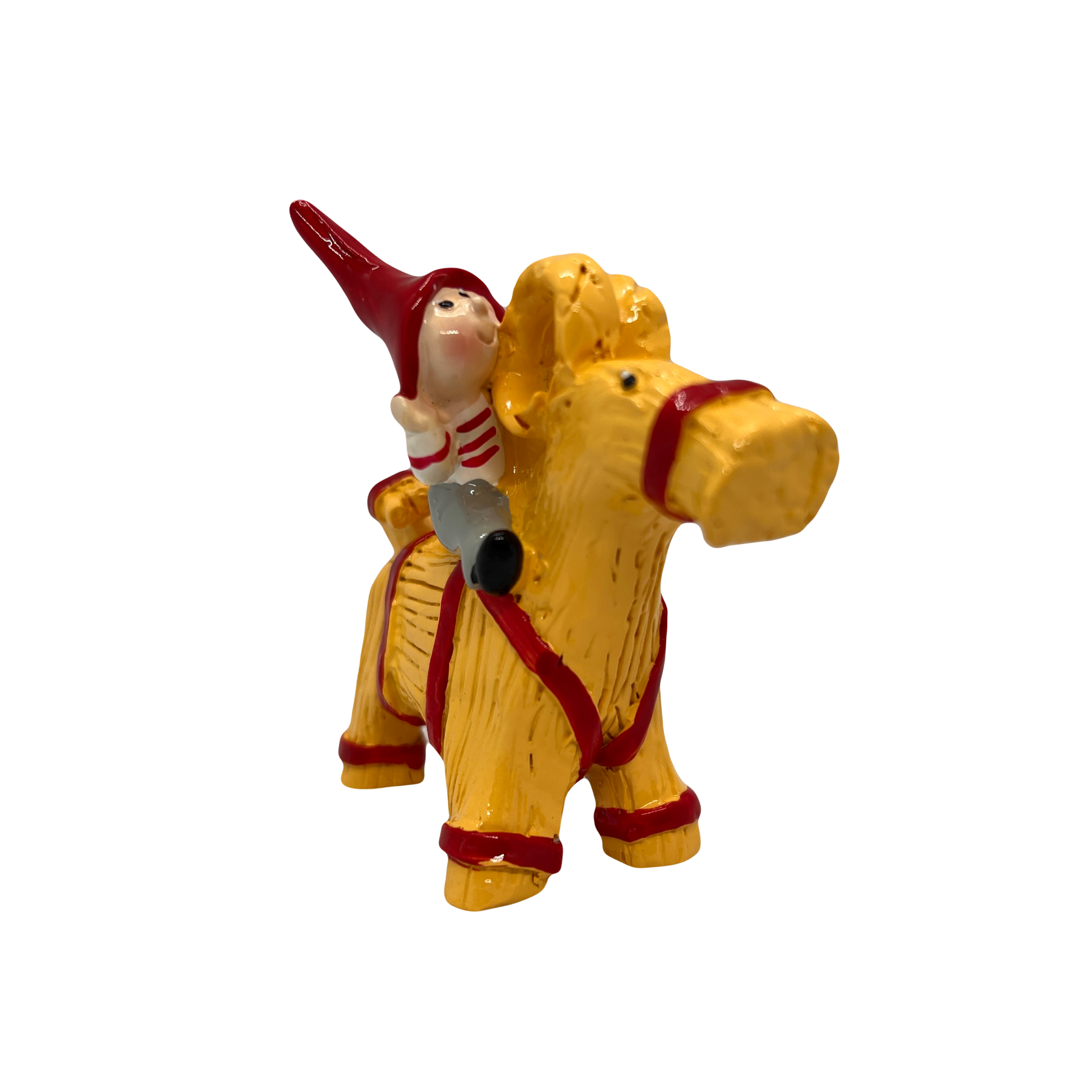 The Tomten Riding a Straw Goat Statue is a ceramic statue featuring Tomten riding on a straw goat. This statue will be the perfect timeless Christmas decoration.