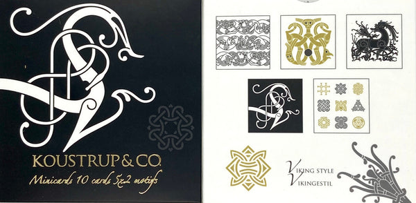 Viking Little Danish Art Notecards includes 5 different artistic viking designs. There are 2 cards for each design, totaling 10 cards. These mini cards will make a handsome note to a friend or family member. These cards are produced by Danish company Koustrup & Co.