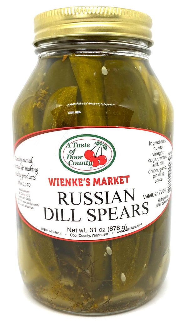 Weinke's Market Russian Dill Pickle Spears are homemade in Door County using only local ingredients. They are a zesty sweet sour pickle that has background notes of garlic and dill. They will be the pickle spear that you can't eat just one.